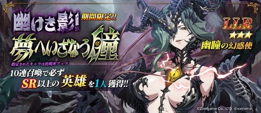『幽けき影!夢へいざなう瞳』は10連召喚で必ずSR以上の英雄を一人獲得できる、期間限定召喚です。LLR幽瞳の幻惑使の出現確率が期間限定でアップします。