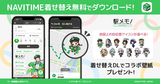 2025年10月14日(火)より「NAVITIME」の着せ替え機能に「駅メモ!」シリーズの着せ替えアイテムが登場します。機能を利用することで、ホーム画面は「駅メモ!」シリーズ仕様のデザインになります。さらに、ナビゲーション中には「駅メモ!」シリーズのキャラクター「でんこ」が目的地までの案内を行い、おでかけを一緒に楽しむことができます。リリースを記念して、オリジナル壁紙プレゼントキャンペーンや、プレミアムプラス会員限定のグッズ抽選キャンペーンも同時に開催します。