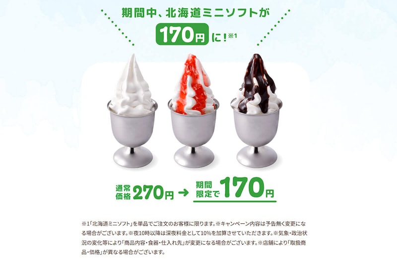値引きの対象は、「北海道ミニソフト」「北海道ミニソフト(イチゴソース)」「北海道ミニソフト(チョコソース)」の3種類。