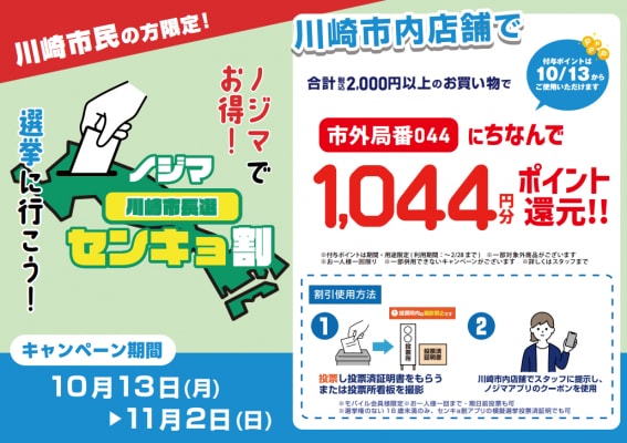 ノジマは、若い世代を中心に選挙について関心を持ってもらうことを目的に「センキョ割」の取り組みを広めている「センキョ割学生実施委員会」に賛同し、2022年から業界で初めてセンキョ割に参加いたしました。これまでに様々なセンキョ割に参加し、今年は千葉県知事選挙、東京都議会議員選挙、参議院議員選挙、横浜市長選挙で実施いたしました。また、今回の川崎市長選挙については川崎市の店長による発案で実施に至りました。