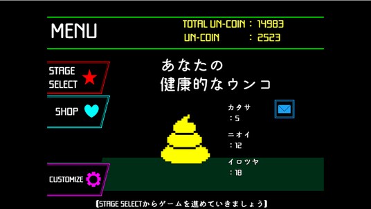 ステージで入手できる「UN-COIN」を消費して、ウンコの見た目をカスタマイズできるガチャを回したり、さらなる高難度ステージを解放したりすることができます。