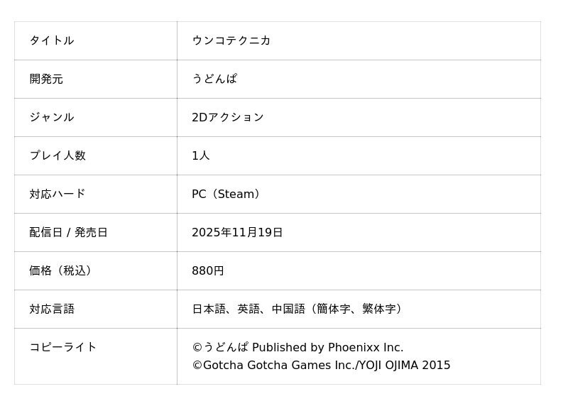 株式会社Phoenixx(フィーニックス)(東京都武蔵野市、代表取締役社長:坂本 和則)は、うどんぱ氏開発の2Dアクションゲーム『ウンコテクニカ』を、2025年11月19日(水)にSteamにて、配信決定したことをお知らせいたします。