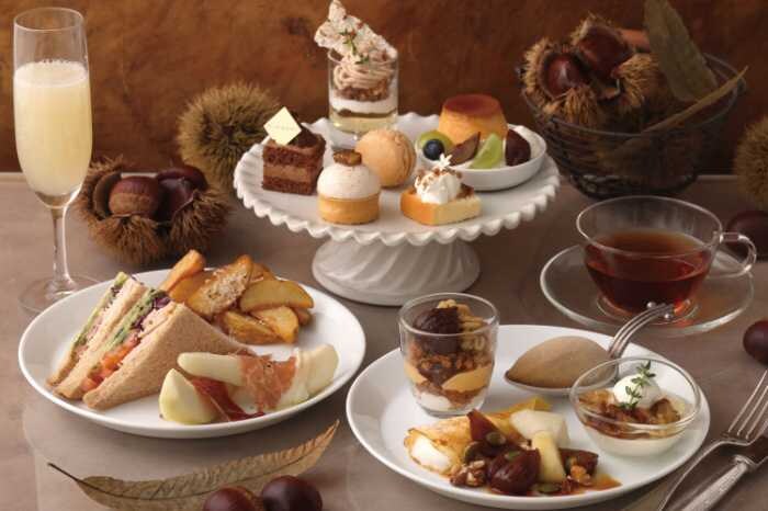 渋皮栗のショコラショートケーキやモンブランパフェ、マロンムースタルトなど、多彩な栗スイーツが並ぶこのアフタヌーンティーは、秋の贅沢なひとときにぴったり。