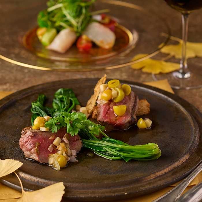 ディナーでは、秋の味覚を楽しむ前菜からデザートまでの6品コースが堪能できます。いちょう並木の黄葉を眺めながら、特別な秋のひとときをお過ごしください♡