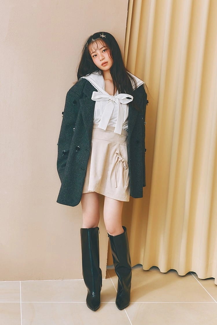 ミニスカート 8,800円/merry jenny ジャケット 39,600円/The Girls Society ブラウス 16,500円/リランドチュール ヘアピン(2個セット)47,300円/ LELET NY(ザ ヘア バー トウキョウ)ブーツ 16,900円/チャールズ&キース(チャールズ&キース ジャパン)
