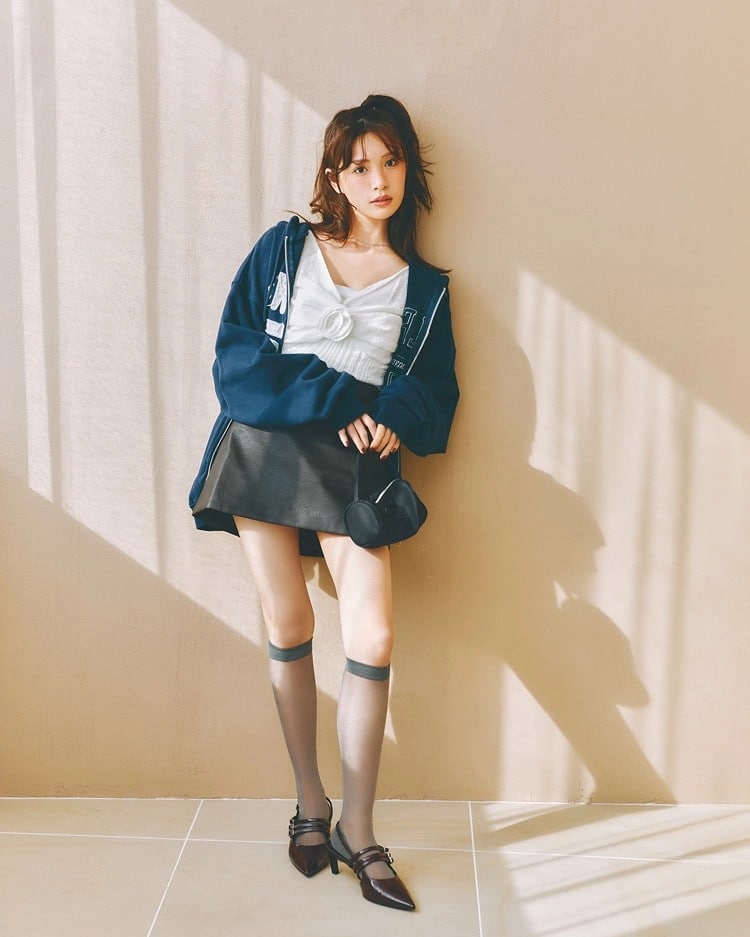 ミニスカート 9,990円/Gap パーカ 12,700円/MOUSSY(バロックジャパンリミテッド)トップス 14,210円/ASURA(HANA KOREA)ネックレス 6,380円/ミミサンジュウサン(サンポークリエイト)バッグ 11,330円/minitmute(HANA SHOWROOM)シューズ 9,900円/チャールズ&キース(チャールズ&キース ジャパン)ソックス/スタイリスト私物