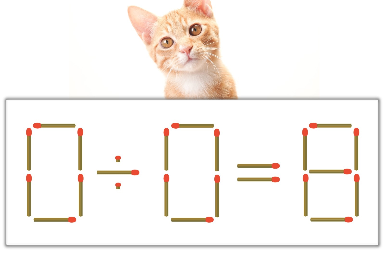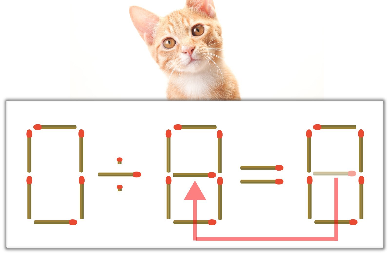 「8」のマッチ棒を1本、左にスライドさせて「8」を作り、「0÷8=0」にする。※解答は複数ある場合があります。