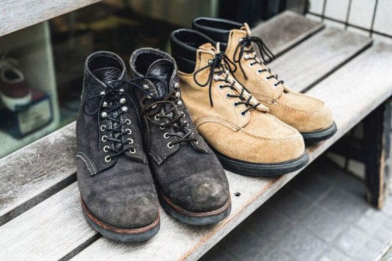 左は日本未発売のモデルで、8821という品番。RED WINGの直営店にて、ブラックソールにカスタマイズしているので、なんとも個性的な仕上がりになっている。右は90年代に人気を博した王道のスーパーソール。ブラックのスムースレザーでなく、スウェードを選択。「最近、RED WINGが自分の中で再燃していて、ブラックソールカスタムを周りに勧めています」