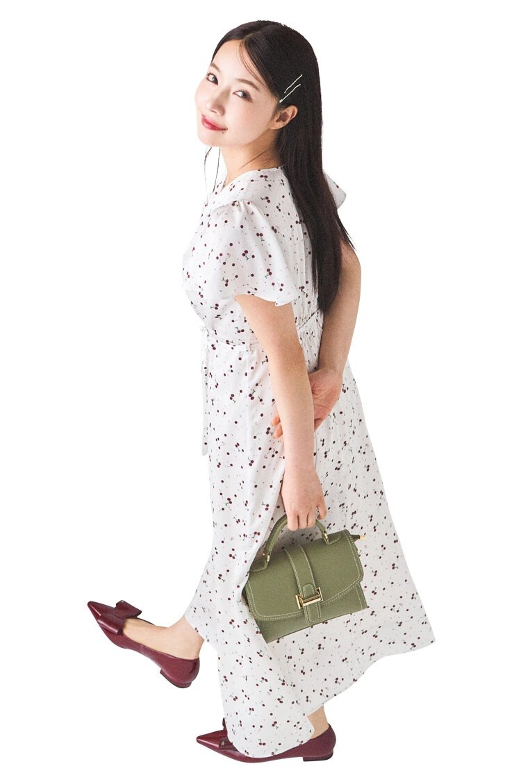 1枚で休日のお出かけコーデが完成する万能ワンピース。チェリー柄の色を拾えばカーキと赤の反対色もサマになる!