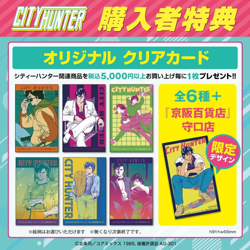 『シティーハンター』関連商品を税込5,000円以上購入ごとに「オリジナル クリアカード」が1枚もらえます。カードは、全6種+限定デザイン1種。好きな絵柄を選ぶことができます。なくなり次第終了です。