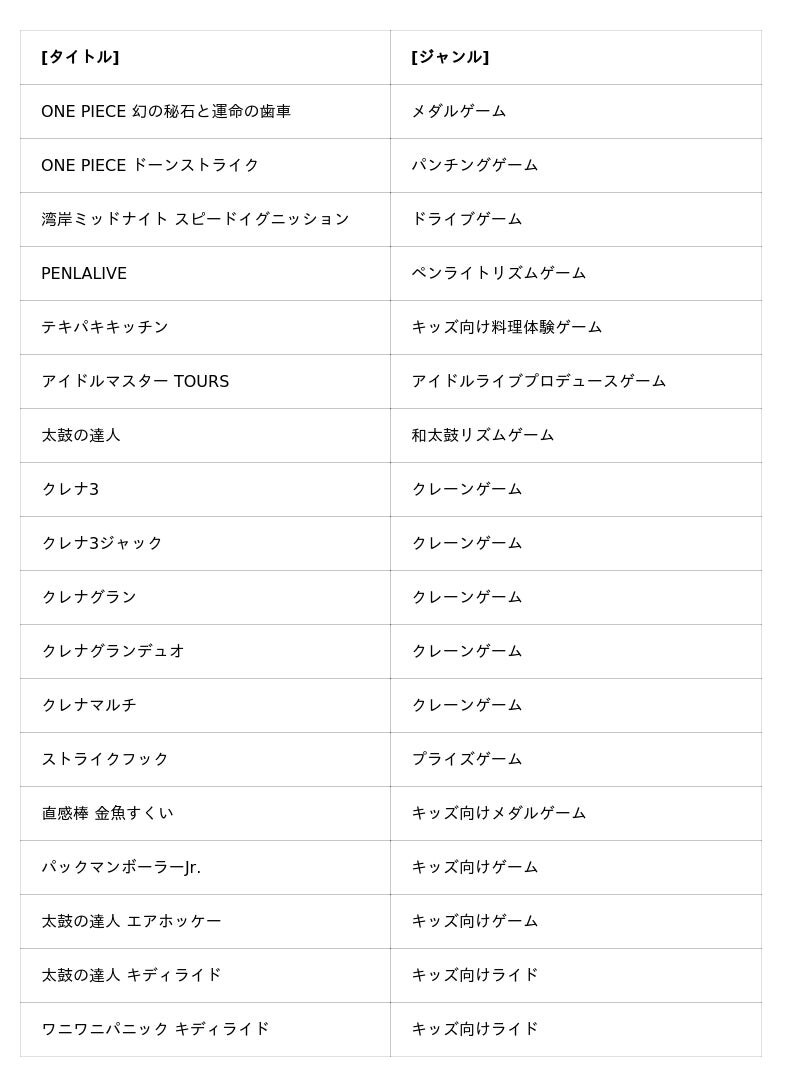 そのほか、パンチングゲーム「ONE PIECE ドーンストライク」、新作リズムゲーム「PENLALIVE(ペンラライブ)」、キッズ向け料理体験ゲーム「テキパキキッチン」など、幅広い年齢層のユーザーにむけた個性豊かなラインアップで出展します。