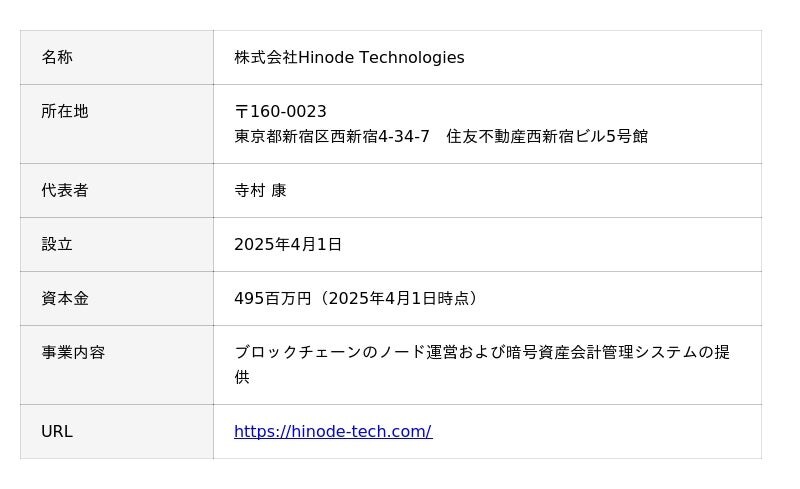 gumiの子会社であるgC LabsとTISとの合弁会社であるHinode Technologiesは、ブロックチェーン技術を活用した分散型社会の実現に向け、「新技術を用いた社会実装を推進することで世界に誇れるシステムインフラを構築し、持続可能な未来を切り拓く」をミッションにWeb3の基盤となるブロックチェーンのノード運営事業を主業として取り組んでおります。将来的には暗号資産の会計管理システム等販売事業も展開する予定です。