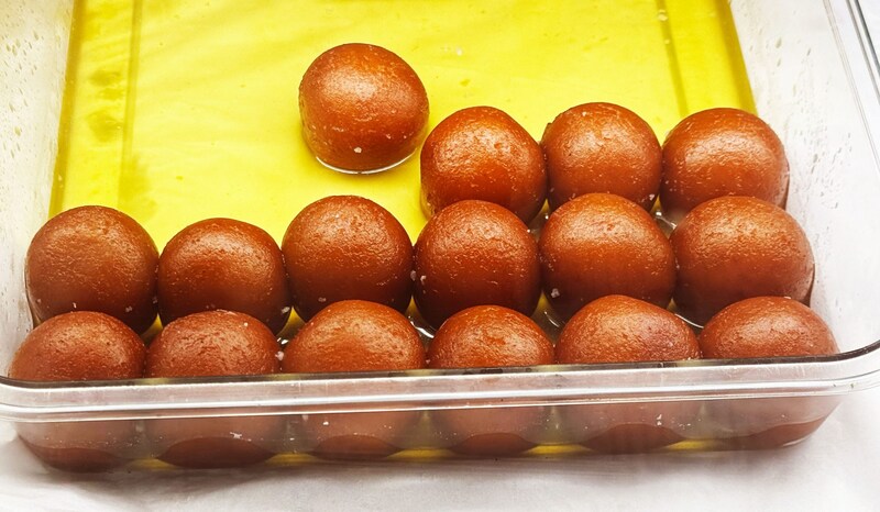 グラブジャムンは小さなボール状で、薫りづけされたシロップがたっぷりと生地に浸透しています。