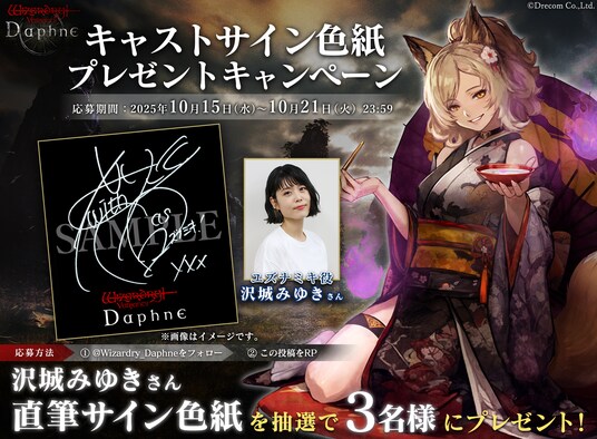 『Wizardry Variants Daphne』公式X(旧Twitter)にて、抽選で3名様にユズナミキ役 沢城みゆきさんの直筆サイン入り色紙が当たるフォロー&リポストキャンペーンを実施いたします。