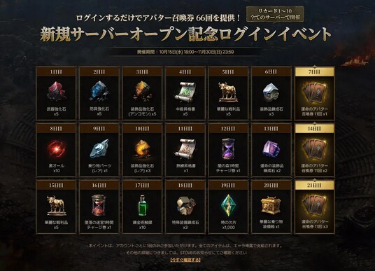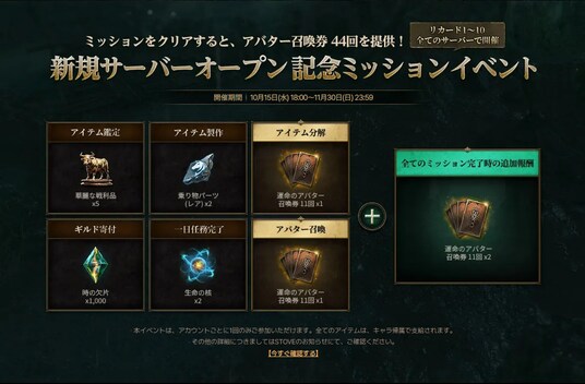 ■新規サーバーのオープンを記念して、最大110回分の「運命のアバター召喚券」などの豪華報酬が獲得できるイベントを開催!