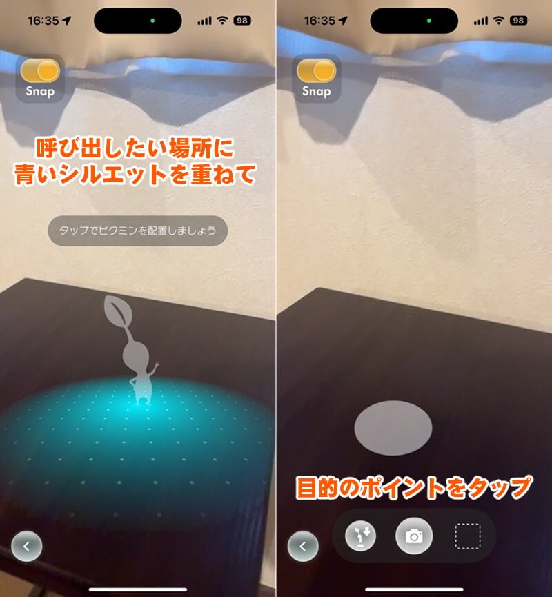 平坦な場所を探していざピクミンを呼び出してみると、想像していたよりも小さかったり、狙い通りのポイントに配置できずにイライラ。