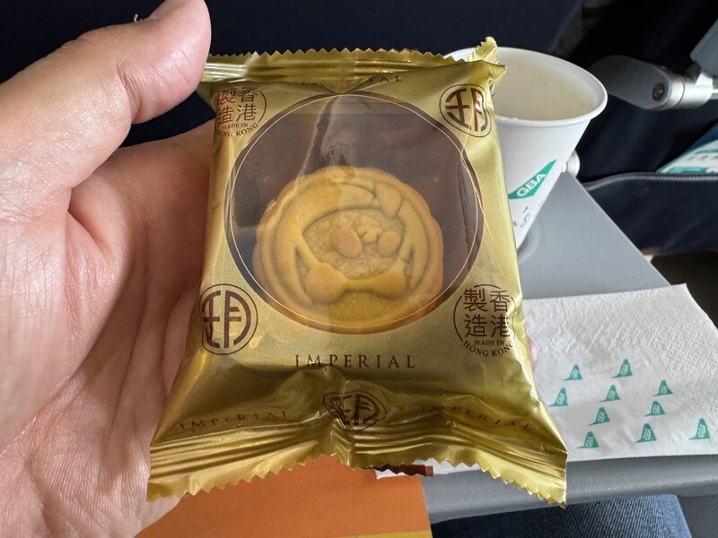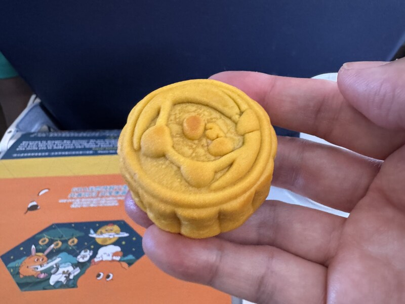 月餅は金色の包装に包まれていて、どうやら香港で作られたもの。開封してみると、中からパンダ? うさぎ? なんらかの模様が描かれた月餅が出てきました。けっこう厚みがあって、食べ応えがありそう。