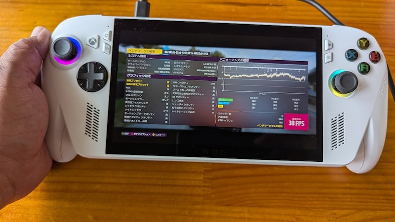 2モデルでパフォーマンスにはどれぐらいの差があるのでしょうか。電源に接続してForza Horizon 5のベンチマークを実行したところ、ROG Xbox Allyの結果は38FPSでした。ターボモード、1080p、120Hzの条件で実行しています。ゲーム中にGame Barで確認したパフォーマンスも39FPS程度で、Forza Horizon 5では安定して40FPS弱のパフォーマンスを発揮している模様。
