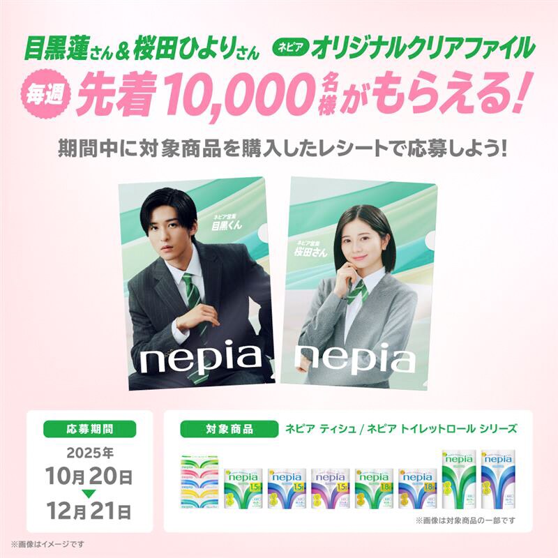 目黒蓮&桜田ひより・ネピアオリジナルクリアファイルを、毎週先着10,000名様・総計90,000名様がもらえるキャンペーンを、10月20日(月)より実施。