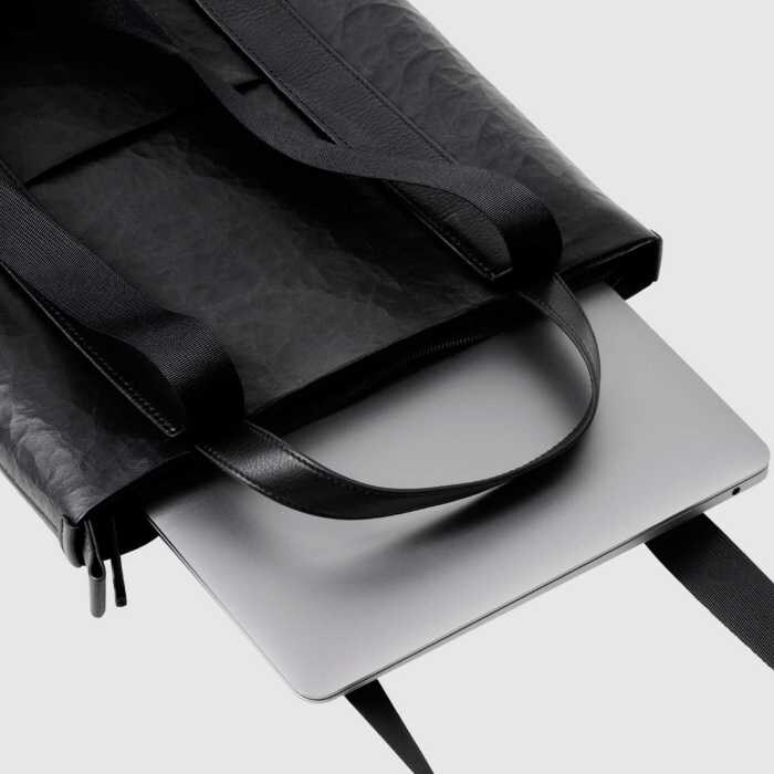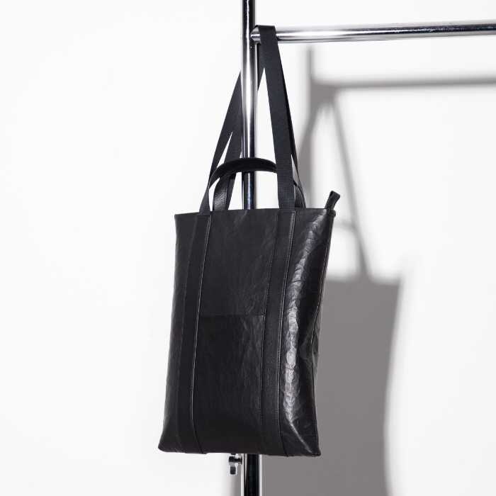 表情の異なる撥水レザーを使用した2way PCトートは、手持ちと肩掛けに対応。縦36.5×横27.5×底マチ2cm、わずか約340gで持ち運びもラクラク。