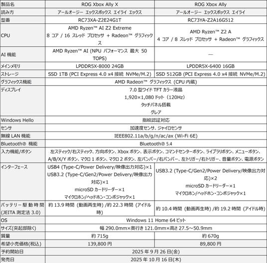 ○ROG Xbox Allyシリーズの製品仕様の概要と発売日および希望小売価格