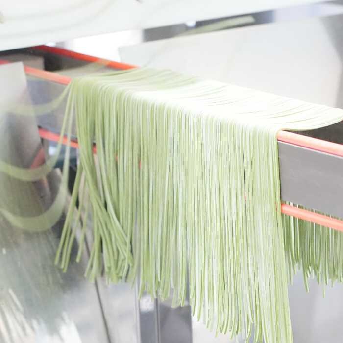 手打ちの足踏み工程を再現した包丁切製法で、細麺ながらしっかりとしたコシと弾力を実現。温度や湿度に応じた微調整を行う熟練の技が、抹茶の色・香り・味わいを均一に行き渡らせます。