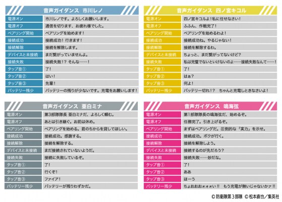 音声ガイダンスは各モデルごとに「市川レノ(CV:加藤渉)」、「四ノ宮キコル(CV:ファイルーズあい)」、「亜白ミナ(CV:瀬戸麻沙美)」、「鳴海弦(CV:内山昂輝)」の録り下ろしボイスを搭載。電源オンやオフ、ペアリング時やタップ音等、各モデル全11ワードの豪華内容となっております。