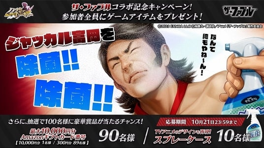 『ザ・ファブル』とのコラボレーションを記念して、参加者全員がゲーム内アイテムがもらえるシリアルコードを獲得できるキャンペーンを実施中です。さらに抽選で10名様に、TVアニメに登場した「ジャッカル除菌スプレー」を再現したスプレーボトル、抽選で90名様にAmazonギフトカード番号が当たるキャンペーンを実施しております。