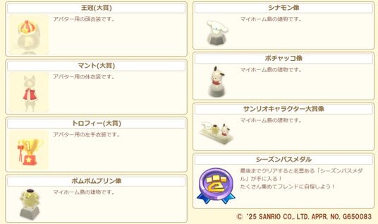 イベントに参加して、株式会社サンリオのキャラクターの人気投票イベント「2025年サンリオキャラクター大賞」で1~3位を獲得したキャラクター(ポムポムプリン、シナモロール、ポチャッコ)の像などの豪華報酬を手に入れよう!