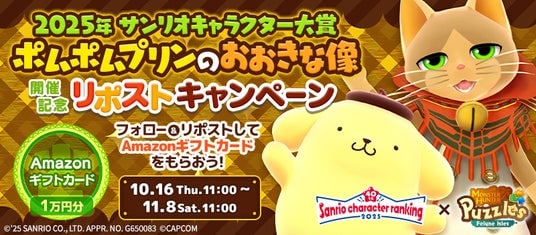 本日2025年10月16日(木)より、「2025年サンリオキャラクター大賞 ポムポムプリンのおおきな像」の開催を記念して、抽選で1万円分のAmazonギフトカードが当たるキャンペーンが開催されます!