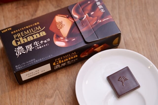 まずは、濃厚な味わいと、スッととろける繊細な口どけが楽しめる『プレミアムガーナ 濃厚生チョコレート<芳醇ミルク>』(想定小売税込価格486円前後)から。12枚入りで、ガーナミルクの薄いシェルの中に、とろける口どけの生チョコが閉じ込められています。