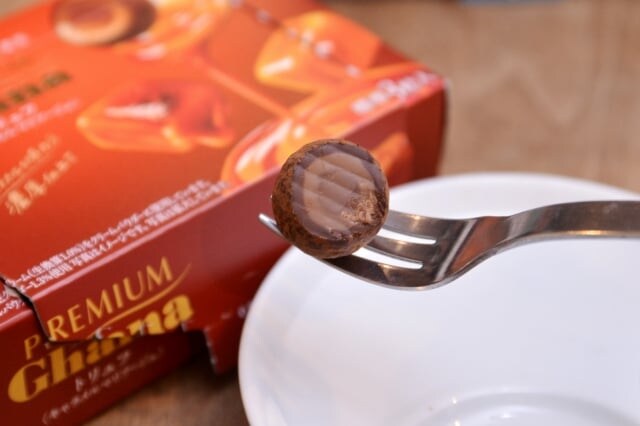 上記、ふたつの『プレミアムガーナ 濃厚生チョコレート』は個包装でしたが、この『プレミアムガーナ トリュフ』は8粒入りのワンパッケージ(想定小売税込価格356円前後)。内側から、ガーナミルク、プレミアムガーナキャラメルミルク、焦がしキャラメル入りガーナブラックの3層構造で、さらにココアパウダーがまぶされている贅沢仕上げとなっています。