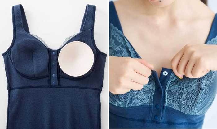 「思いやりで包み込む綿100%ブラタンク&ショーツ〈ハーフオープン〉」は、金属を使わず、スナップボタンで開閉できるハーフオープンタイプ。授乳や診察シーンでも安心の仕様です。