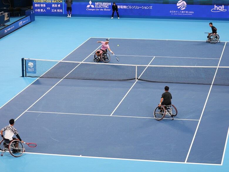 車いすテニス・世界ランキング1位で今年、「生涯ゴールデンスラム」を達成した現役トッププレーヤーの小田凱人と、元世界ランキング1位で生涯ゴールデンスラムのほか、年間グランドスラムを計5回達成し、2023年1月に第一線を退いた国枝慎吾さん。“新旧レジェンド”の2人が、100回目という節目の大会を迎えた「三菱電機ビルソリューションズ 全日本テニス選手権100th Supported by 橋本総業ホールディングス」のエキジビションマッチに登場した。(以下、敬称略)