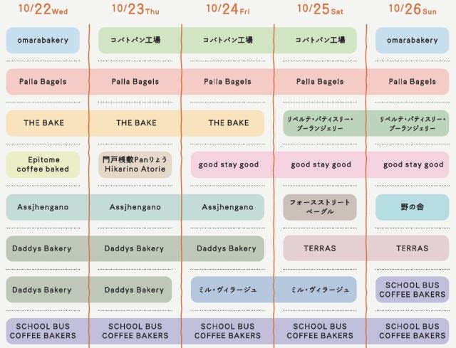 食べログ評価の高い「THE BAKE」、国産小麦100%を使用した「Palla Bagels」、材料からこだわった本格ベーカリー「SCHOOL BUS COFFEE BAKERS」、保存料不使用の「Daddys Bakery」、素材と製法にこだわった「フォースストリートベーグル」など、どれも見逃せないラインナップです。
