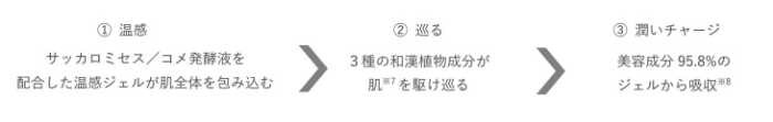 保湿成分サッカロミセス/コメ発酵液※4、ウンシュウミカン果皮エキスやシャクヤク根エキス、ボタンエキス※5の和漢植物、ヒアルロン酸Naや加水分解ローヤルゼリーエキス※6などを配合。
