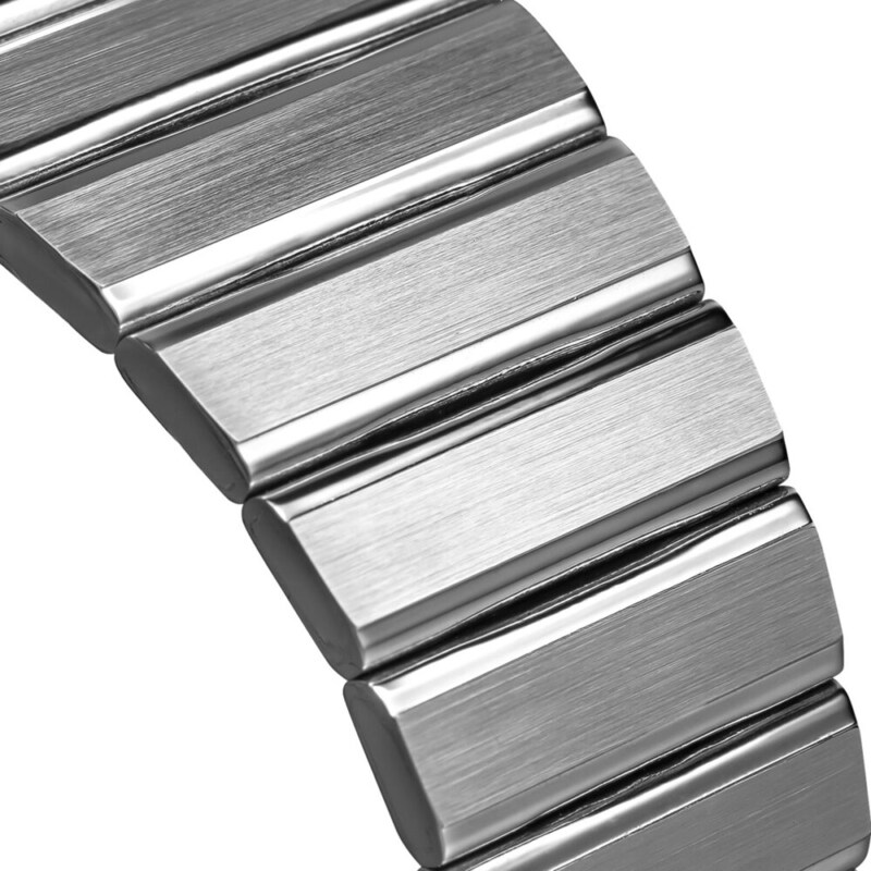 ケースと調和するサテン仕上げのステンレススチールブレスレットは、シンプルながらも都会的な印象を演出。19mmのラグ幅に合わせた堅牢な設計により、どんな腕元にも心地よくフィットする快適な装着感を実現している。