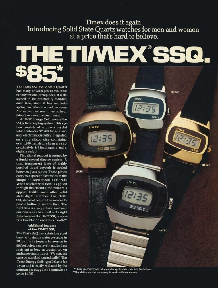 もちろんタイメックスも例外ではなく、当時最先端で人気もうなぎのぼりだったデジタルウォッチ需要に応えて1975年に『SSQ』をリリース。独特で凝ったケースフォルムとデザイン、さらに85ドルという当時のクォーツ時計の価格帯を考えても抜群のコストパフォーマンスで一躍話題となった。