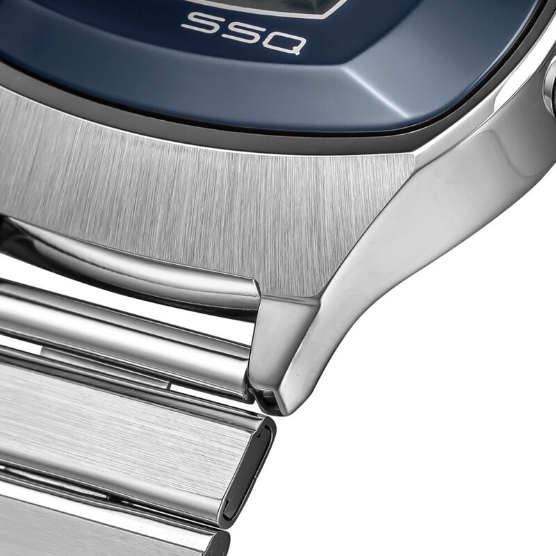 液晶周りにはコンケーブした樹脂製パーツをはめ込み、そこにブランドロゴのほか、当時最先端技術であったSSQ(訳注:Solid State Quartzの略。ICチップやトランジスタなどの半導体技術と水晶振動子を組み合わせた精度の高い電子式時計のこと)の文字が入る。