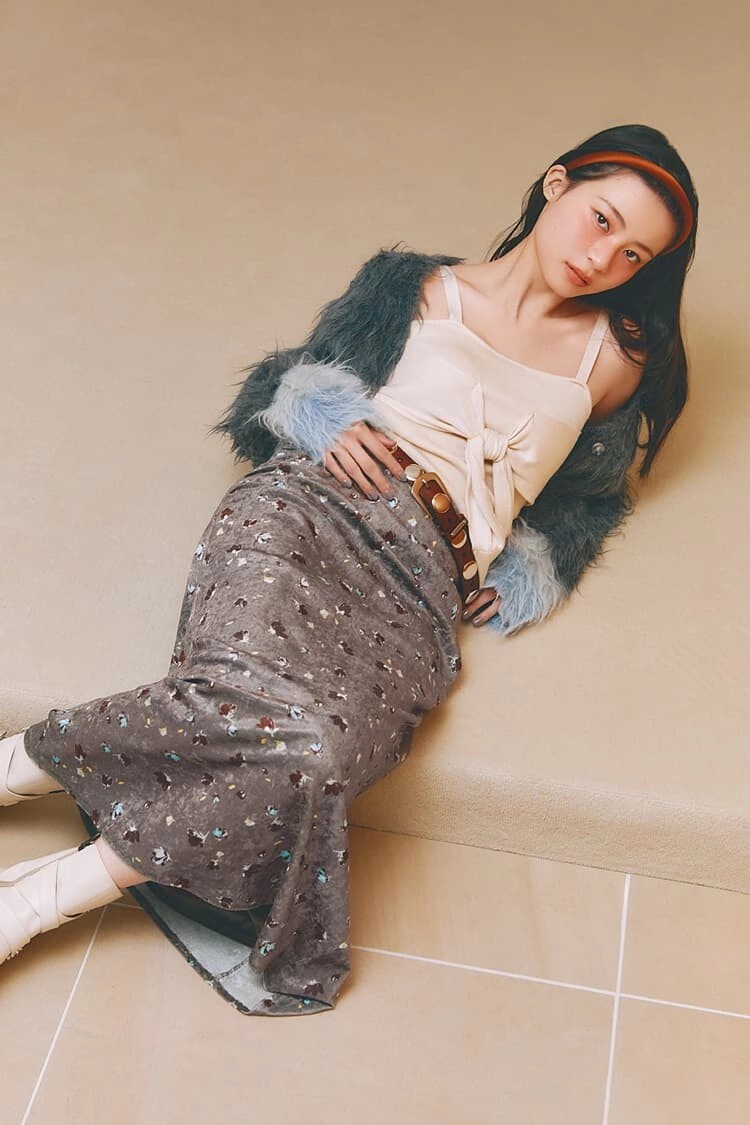 ニットカーディガンにベロアスカートのあわせで都会的な雰囲気マシマシに♡ レザーベルトとカチューシャの小物でコーデ全体が引き締まる。