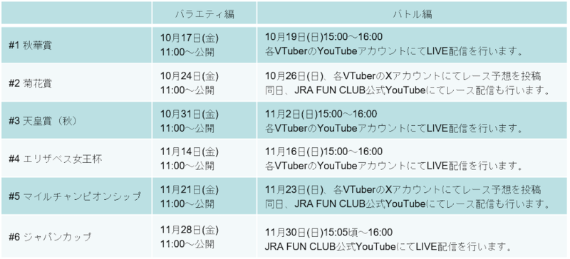 秋華賞が開催される10月19日には、各VTuberのYouTubeアカウントにて予想LIVE配信が行うバトル編も開催されるので、各VTuberのファンの方だけでなく、競馬ファンの方もぜひご覧ください。