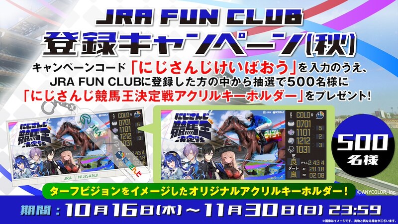 指定されたキャンペーンコードを入力し、JRA FUN CLUBに登録した方の中から、抽選で500名に「にじさんじ競馬王決定戦アクリルキーホルダー」がプレゼントされます。