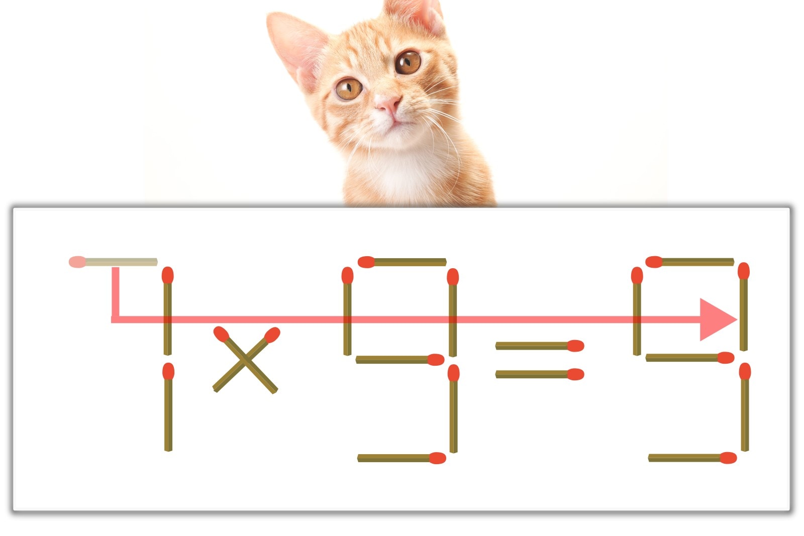 「7」のマッチ棒を1本、右にスライドさせて「9」を作り、「1×9=9」にする。※解答は複数ある場合があります。
