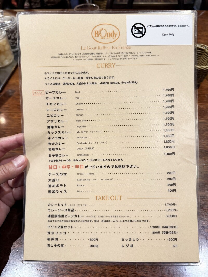 ここのカレーは大人気。ビーフカレー、ポークカレー、チキンカレー、エビカレー、野菜カレー、そのほか多数のカレーラインナップがある。特にビーフカレーにファンが多く、トロトロ食感の厚切り肉の旨味は甘美。その味を求めて遠方から訪れる人もいるほどだ。