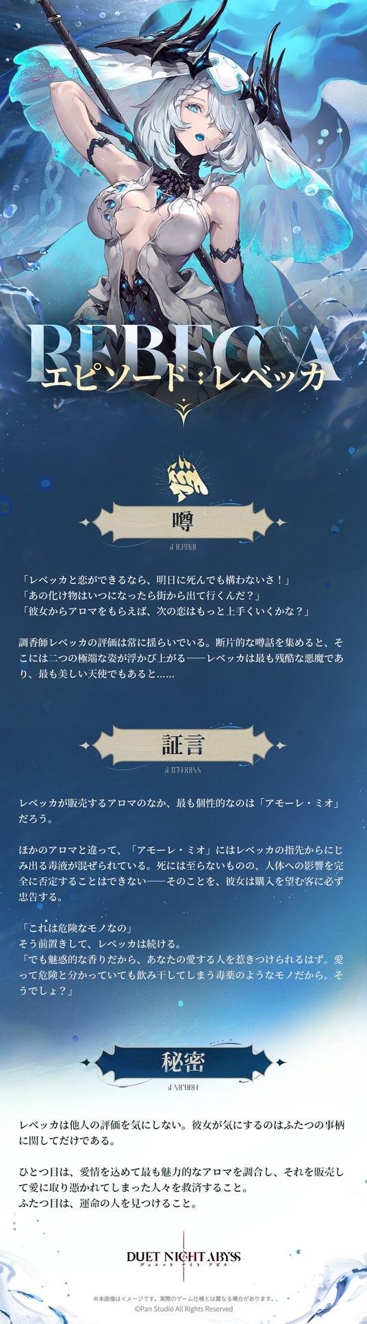 「レベッカ」のキャラクターPV「雨のなかのダンス」を、『デュエットナイトアビス』公式Youtubeチャンネル、および公式X(旧Twitter)にて公開いたしました。ぜひご覧ください。