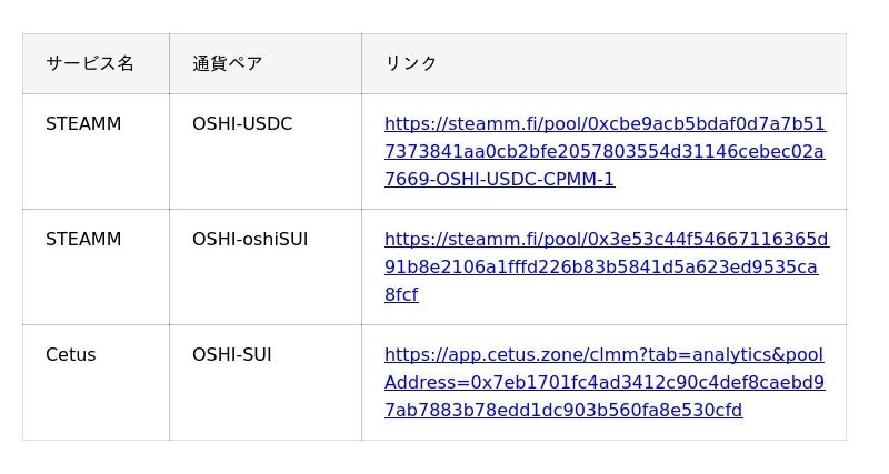 Sui Network上の代表的なレンディングプロトコルであるSuilendが運営するDEX「STEAMM」において、既存の「OSHI-USDCペア」に加えて新たに「OSHI-oshiSUIペア」の取り扱いが開始されます。またSuiエコシステムを代表するDEXのひとつであるCetus Protocolが運営する「Cetus」において、「OSHI-SUIペア」の取り扱いが開始されます。これにより、複数の取引ペアを通じて流動性が確保され、より安定的な市場形成が期待されます。
