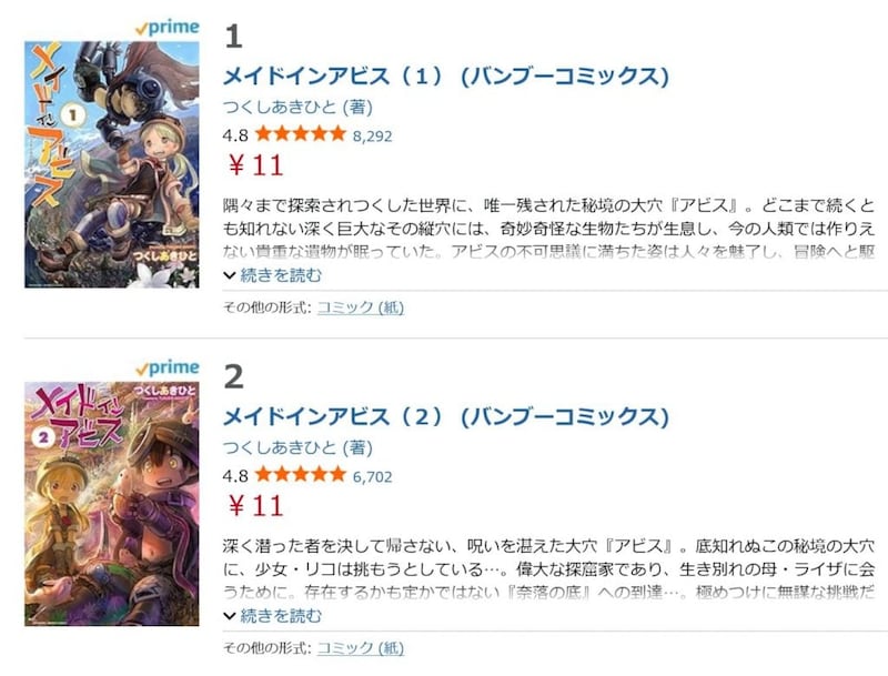 10月17日現在、AmazonKindleや楽天Koboなどの電子書籍サイトで、つくしあきひと先生の「メイドインアビス」がお得な価格で販売されている。