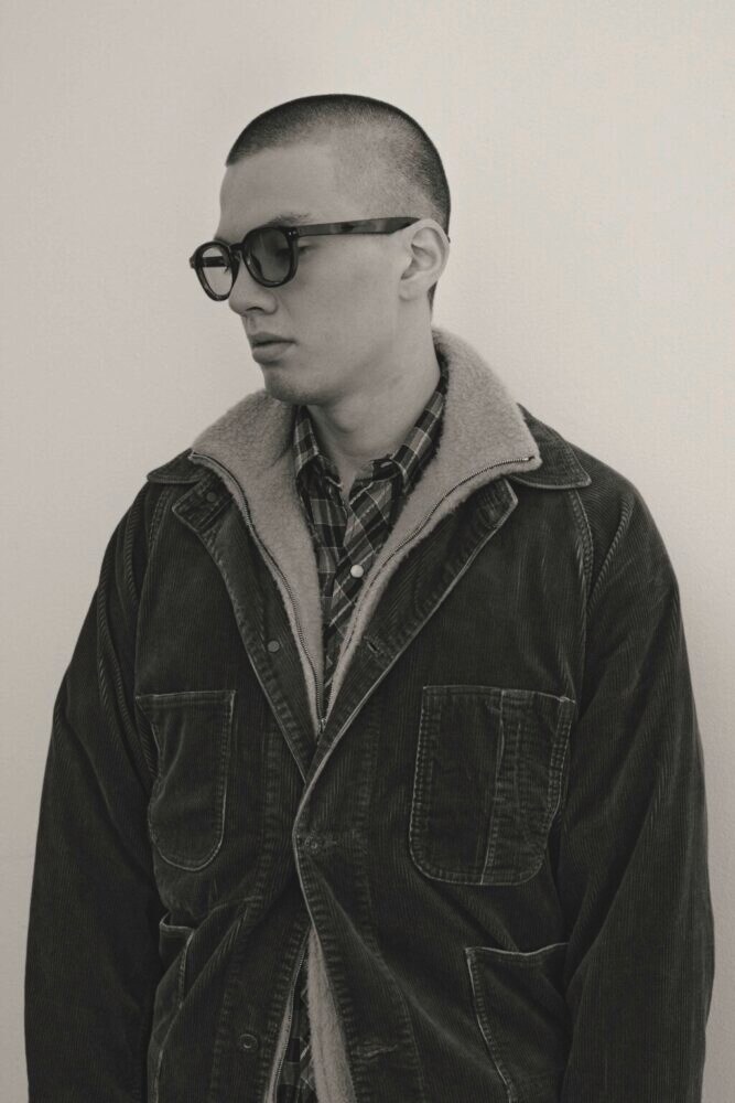 着古したような雰囲気を醸す9ウェルの太畝コーデュロイジャケットは、ラグランスリーブ、2本針巻き縫い、ペン挿しポケットなど、40年代のヴィンテージワークジャケットから着想を得ている。コーデュロイワークコート4万6200円、ウールフリーストラックジャケット8万6900円/ともにゴールド(東洋エンタープライズTEL03-3632-2321)、ウエスタンシャツ2万1780円(セカンドブームTEL03-3462-1721)、メガネはスタイリスト私物