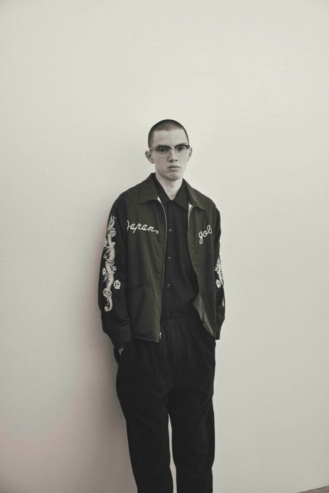 ベトナムジャケットをベースに背面に髑髏をあしらった一着は、エイジング加工を施したレーヨン混コットンツイルを採用。美しいドレープ感が楽しめる。スカルジャケット6万6000円、ウール開襟シャツ4万4000円、ウールイージーパンツ4万9500円/すべてゴールド(東洋エンタープライズTEL03-3632-2321)、メガネ5万6100円/イエローズプラス(コンティニュエTEL03-3792-8978)