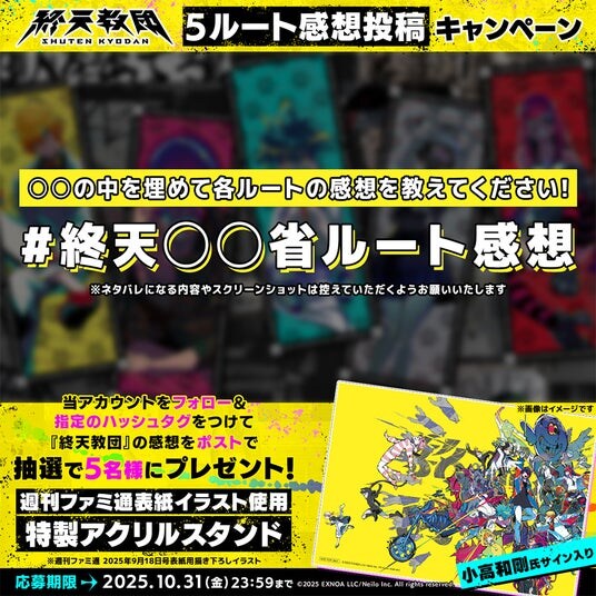 10月15日(水)より、『終天教団』をプレイされた皆様の各ルートの感想を、指定のハッシュタグを付けてご投稿いただくと、抽選で5名様にオリジナルB6アクリルスタンドが当たるXハッシュタグキャンペーンを開催いたします。